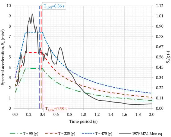 Response spectrum of Type 1 for reference return periods, TNCR, of 95, 225, and 475 years [25], respectively, and of the Mw = 7.1 1979 Montenegro earthquake [74,75] recorded at Herzeg Novi station in the N-S direction for behavior factor q = 1.0 (at a 50 km distance from Dubrovnik’s Old City) with the corresponding building’s measured pre-retrofitting fundamental periods in the N-S and E-W directions, i.e., T1,NS and T1,EW, respectively.