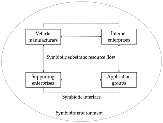 Symbiosis theory originates in biology and is proposed by the biologist DeBerry. It is widely used in biology to explore the relationship between different populations. DeBerry [32] points out that symbiosis is the linkage of different populations based on different beneficial relationships, and Caullery [29] deepened the concept of symbiosis and further proposed the concepts of parasitism, symbiosis, and reciprocal symbiosis for the relationship between populations. Scott [33] believes that the equilibrium relationship between two or more interdependent populations is symbiosis. In the mid-20th century, symbiosis theory was gradually introduced into other research fields, such as management, sociology, and economics. According to the symbiosis theory, this study considers that a symbiotic system composed of populations consists of five elements: symbiotic unit, symbiotic substrate, symbiotic interface, symbiotic environment, and symbiotic pattern. In the smart car digital innovation ecosystem, a cohesive integration of various elements rooted in the symbiosis theory will achieve not only technological advancement but also sustainable development. It is shown in Figure 1.