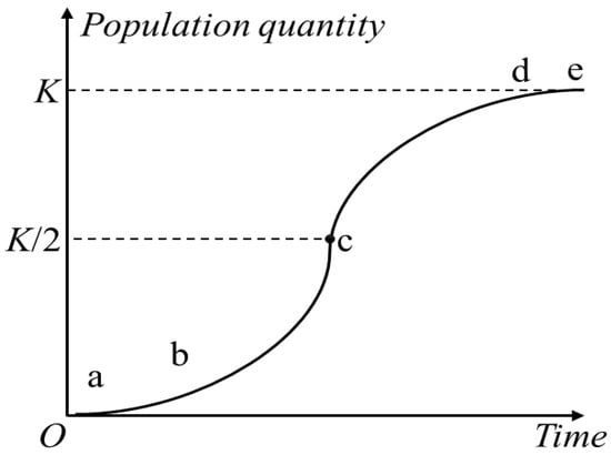 Ecosystem change is a dynamic process. Symbiotic units, patterns, and interactions change over time with the external environment. This reflects the evolutionary nature of ecosystems. With the gradual evolution of symbiotic units, the innovation ecosystem exhibits the qualities of symbiotic evolution. Symbiotic evolution could keep system diversity in a prolonged evolution [35]. Through symbiotic evolution between various groups, the ecosystem could develop and evolve sustainably. In natural ecosystems, the number of species, the relationships between species, and the components of the ecosystem change over time. Ecosystems are dynamic when species interact with the external environment to make the ecosystem sustainable. Symbiotic evolution also exists in the development of smart cars. The smart car digital innovation ecosystem is a complex, dynamic evolutionary system composed of multiple elements and subjects. The populations within the ecosystem interact with the environment and dynamically influence each other. The growth pattern of the population is divided into Malthus and logistic [36]. Malthus shows a J-shaped growth. It is essentially exponential growth based on the idea of the function being proportional to the speed at which the function grows. Logistic shows an S-shaped growth. It points out that the initial stage of growth is approximately exponential (geometric); then, as saturation begins, the growth slows to linear (arithmetic), and at maturity, growth stops. Since the populations in the smart car digital innovation ecosystem will be influenced by economic, political, and technological aspects, this study considers that the populations follow the logistic pattern. The life cycle will go through four periods: the start-up period, the growth period, the maturity period, and the saturation period. This is shown in Figure 2.