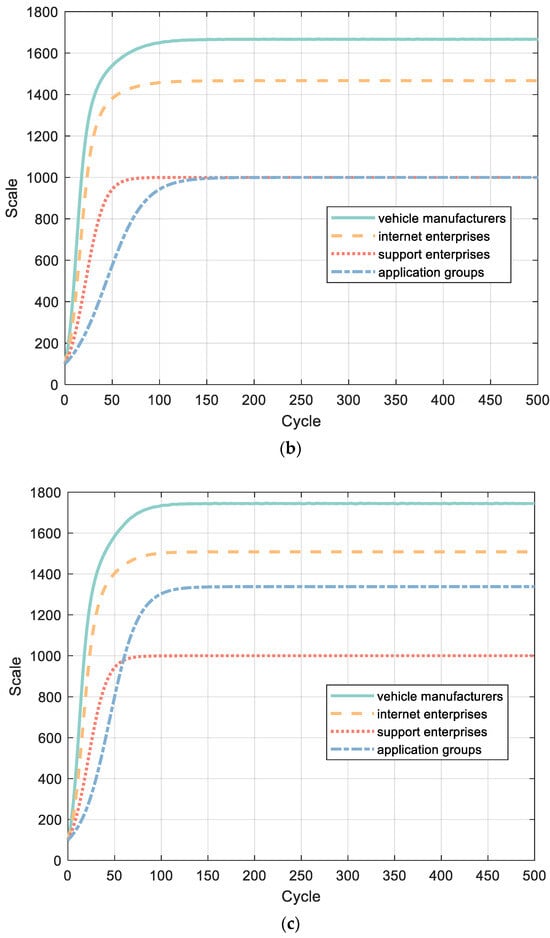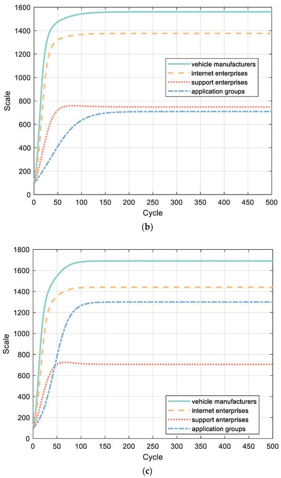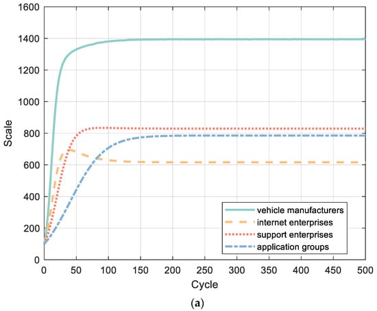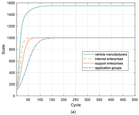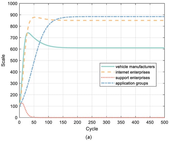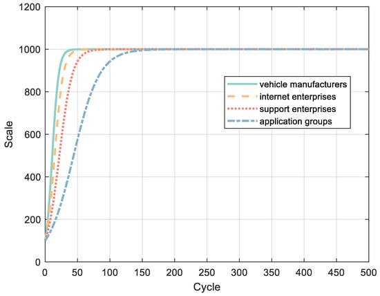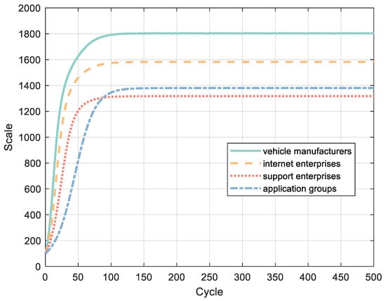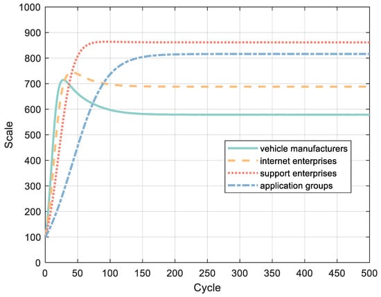 It is assumed that the natural growth rates of automobile manufacturers, internet enterprises, supporting enterprises, and application groups are 0.2, 0.15, 0.1, and 0.05, respectively [17]. The initial size of all four populations is 100. Under the condition of limited resources, the maximum size that can be reached by the independent development of vehicle manufacturers, internet enterprises, supporting enterprises, and application groups is 1000. The evolutionary cycle is 500. The symbiosis degree is mainly set according to the model conditions and the equilibrium point shown in Table 2.