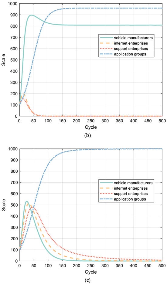 The vicious competition is required to satisfy the symbiosis degree (Table 5). It includes three types. One is that the supporting enterprise is consumed by the other three populations with a large number of innovative resources. Moreover, it declines and eventually tends to disappear after a short upward development. In contrast, the remaining three populations survive in the competition. The final scale is close to the upper limit of independent development, as shown in Figure 5a. The second type is that the supporting enterprise and the vehicle manufacturer are consumed by the resources of the remaining two populations. Eventually, the supporting enterprise and the internet enterprise tend to die out. The other two populations survive in the competition and eventually approach the size with a maximum of 1000. The evolutionary scale is shown in Figure 5b. The third type is that only the application group survives in the competition. The last three populations grow briefly in competition, then decline and eventually die out. At this time, the application group will eventually reach the upper limit of the population size (see Figure 5c).
