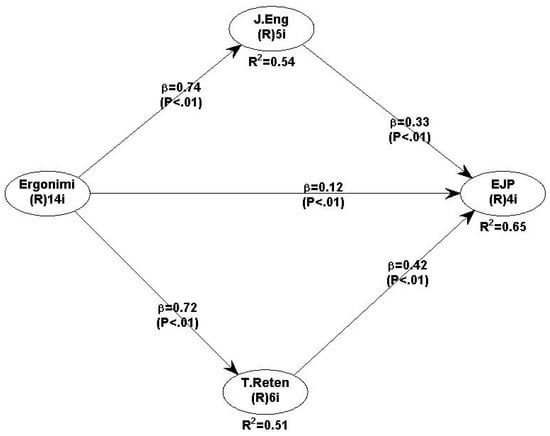 In addition, Figure 2 illustrated that ergonomics interpreted 54% of the variance in work engagement (R2 = 0.54) and 51% of the variance in talent retention (R2 = 0.51). Moreover, ergonomics, work engagement, and talent retention explained 65% of the variance in job performance (R2 = 0.65).