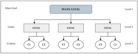 According to the AHP method, unstructured and poorly structured problems are broken down into components such as the main goal, goals, and criteria. After that, these parts are arranged in a hierarchical structure of goals (HSG) for a better understanding of the problem (Figure 1). The number of goals on the second hierarchical level and criteria on the third hierarchical level depends on the type of problem that needs to be solved.