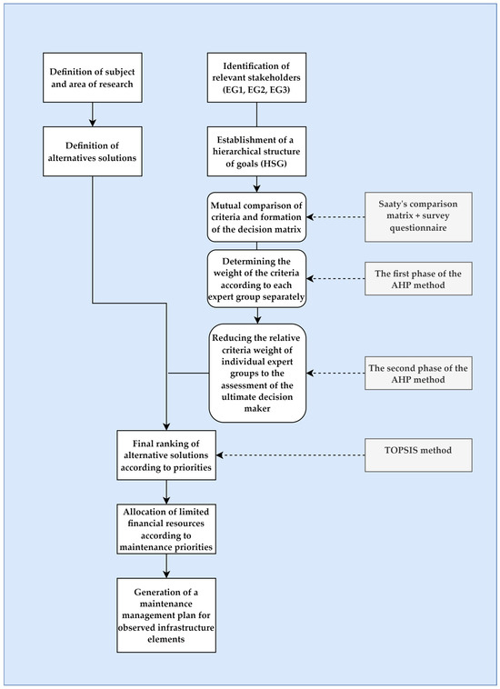This paper aims to form a concept of infrastructure management based on a multicriteria approach to determining management priorities. As the complexity of infrastructure construction and maintenance management requires looking at this problem from different aspects, the proposed multicriteria approach in this paper is based on the application of a two-phase analytical hierarchy process (AHP) method and technique for order of preference by similarity to ideal solution (TOPSIS) method. Using the two-phase AHP method, the process of determining the relative weights of the criteria is improved with the aim of providing better management of stakeholders as one of the essential preconditions for the success of the entire management process. In this way, it is desired to simulate the decision-making process as realistically as possible, in which the opinions and interests of all stakeholders are respected, but the key decision-maker is responsible for the final decision. Furthermore, with the help of the TOPSIS method, a ranking list of maintenance management priorities is formed, based on which it is possible to distribute limited financial resources intended for annual maintenance more rationally. The stability of the TOPSIS results was confirmed by a sensitivity analysis when changing the relative weights of the criteria. The proposed allocation of financial resources represents the basis for a better design of the maintenance management plan of the analyzed infrastructure elements, thus completing the observed gap in the existing literature. The aim of the above is to improve the planning function and at the same time to improve the implementation, monitoring, and control management functions, which creates a more efficient management system that can preserve the value of the analyzed infrastructure elements and extend their lifetime.