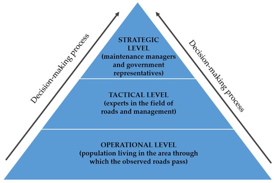 where wcij is the final relative weight of the i-th criterion belonging to the j-th goal. For that matter, wcij is calculated as the product of the weight of the i-th goal determined by the representative of the government and the weight of the i-th criterion obtained according to the assessment of all involved stakeholders. In this way, it is possible to include the opinions of all stakeholders in the decision-making process, which is a prerequisite for successful planning, but the final decisions at the strategic level are made in this case by government representatives, thus deciding on the future development of the analyzed infrastructural elements. According to that, the decision-making process is simulated from the operational and tactical levels to the strategic decision-making or management level. At the same time, lower hierarchical levels provide information about the opinions of the involved stakeholders through information flows to higher levels of decision-making and management [38].