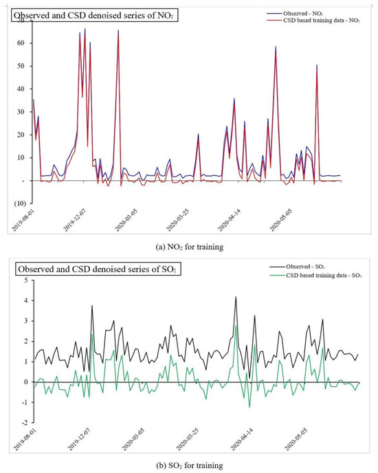The initial stage in the CSD-AI-based learning paradigm that has been presented is to use CSD to denoise the data gathered on the NO2 concentration, and the related outcome can be shown in Figure 4. The second phase is to make projections based on the cleansed data using a specific and very accurate forecasting program (e.g., SVE and GAN). In addition, a set of benchmark models, which may include single or hybrid forecasting models, is executed to make comparisons.