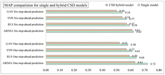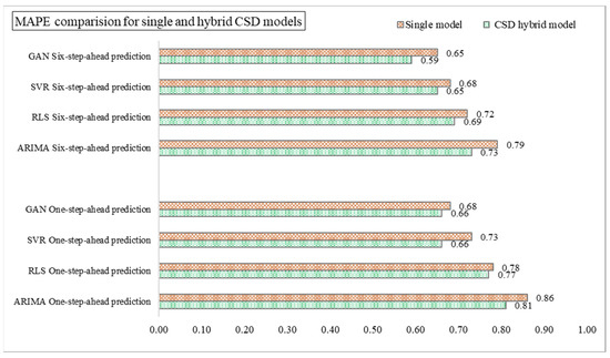 The comparison in terms of MAPE for single as well as hybrid CSD models is reported in Figure 5. It can be noted that the CSD hybrid models show better performance as compared to single models. The MAPE value of the hybrid models is lower than the MAPE of single models. In one-step-ahead prediction, the MAPEs of the CSD-based SVR and GAN hybrid models are lower than those of the CSD-based traditional models, such as ARIMA and RLS. The performance of CSD-SVR and CSD-GAN in one-step-ahead prediction is the same. However, in six-step-ahead prediction, CSD-SVR and CSD-GAN outperform the traditional model with lower MAPE values. However, the performance of CSD-GAN is more prominent, with the lowest MAPE value. This indicates that the directional prediction capability of the hybrid models is superior to the traditional model in both one-step- and six-step-ahead prediction.