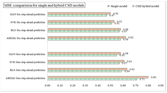 To check the performance of the single and hybrid CSD models (CSD-SVR and CSD-GAN), MSE is also used, and the results are reported in Figure 6. In one-step-ahead prediction, the MSE values of CSD-SVR and CSD-GAN are lower than the traditional CSD-RLS and CSD-ARIMA models. Likewise, single AI models (SVR and GAN) also show better performance with lower MSE values than the MSE value of RLS. Similarly, in six-step-ahead prediction, the AI models perform better than the traditional model in both the single (SVR, GAN) and CSD-based models (CSD-SVR, CSD-GAN). The MSE values of SVR and GAN are lower than RLS. Also, CSD-SVR and CSD-GAN show lower MSE values than CSD-RLS. This proves the superiority of the hybrid models for directional prediction. A comparison of CSD-SVR’s and CSD-GAN’s performance validates the superiority of the CSD-GAN model with the most negligible MSE value.
