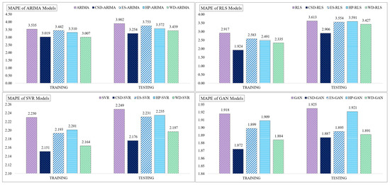 Verifying CSD’s superiority over other denoising techniques is vital before moving on to accurate forecasting. Figure 9 displays the results of using several denoising methods for evaluation. These approaches include ES, HP, and WD. Comparing the MAPEs of ARIMA, CSD-ARIMA, ES-ARIMA, HP-ARIMA, and WD-ARIMA, we have affirmed the minimum error value of MAPE in the case of the CSD-based ARIMA. In the case of robust least squares, CSD-RLS has a lower MAPE for the training and testing data. However, CSD-RLS outperforms the other denoising methods. Regarding the MAPEs of SVR, CSD-SVR, ES-SVR, HP-SVR, and WD-SVR, HP-SVR has a lower MAPE for the training and testing data. However, CSD-SVR outperforms the other denoising methods. The third model is GAN, and it can be noted that, based on the MAPEs of GAN, CSD-GAN, ES-GAN, HP-GAN, and WD-GAN, CSD-GAN has a lower MAPE for the training and testing data. However, CSD-GAN outperforms the other denoising methods. Hence, it is not wrong to say that among the CSD-RLS, CSD-SVR, and CSD-GAN, the CSD-GAN has the lower MAPE; however, according to the MAPE, the CSD-GAN outperforms the other hybrid models, proving the superiority of this model.