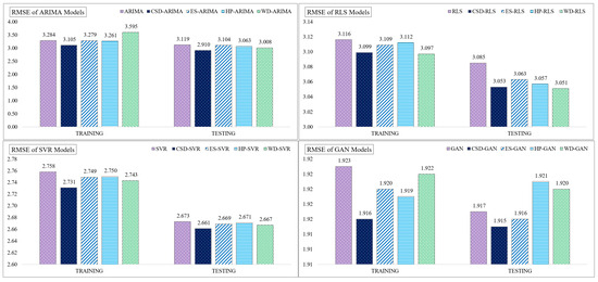 RMSE is also used to compare the performance of denoising techniques, and the results of the RMSE are shown in Figure 11. Here, with the comparison of the RMSEs of ARIMA, CSD-ARIMA, ES-ARIMA, HP-ARIMA and WD-ARIMA, we have concluded the lowest error for CSD-ARIMA. In the case of the RLS and denoised RLS models, CSD-RLS has a lower RMSE for the training and testing data. However, CSD-RLS outperforms the other denoising methods. In the same way, a comparison of the RMSEs of SVR, CSD-SVR, ES-SVR, HP-SVR, and WD-SVR suggests that CSD-SVR has a lower RMSE for the training and testing data. However, CSD-SVR outperforms the other denoising methods. Additionally, comparing the RMSEs of GAN, CSD-GAN, ES-GAN, HP-GAN, and WD-GAN shows that CSD-GAN has a lower RMSE for the training and testing data. However, CSD-GAN outperforms the other denoising methods. Hence, among the CSD-ARIMA, CSD-RLS, CSD-SVR, and CSD-GAN, the CSD-GAN has the lower RMSE; however, according to the RMSE, the CSD-GAN outperforms the other denoising techniques.