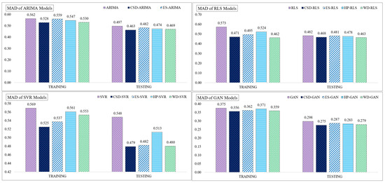 The last criterion is MAD, which is used to compare the denoising techniques, and the results are presented in Figure 12. In the comparison of the MAD values of traditional regression and denoised-based models, we presented that CSD-ARIMA and CSD-RLS have lower MADs for the training and testing data. However, the CSD-based traditional models outperform other denoising methods. When the MAD of the SVR model is consulted, it is noted that (from the MAD of SVR, CSD-SVR, ES-SVR, HP-SVR, and WD-SVR), CSD-SVR has a lower MAD for the training and testing data. However, CSD-GAN outperforms the other denoising methods. Additionally, a comparison of the MADs of GAN, CSD-GAN, ES-GAN, HP-GAN, and WD-GAN validates that CSD-GAN has a lower MAD for the training and testing data. However, CSD-GAN outperforms the other denoising methods. From these results, it is clear that among the CSD-ARIMA, CSD-RLS, CSD-SVR, and CSD-GAN, the CSD-GAN has the lower MAD; however, according to the MAD, the CSD-SVR outperforms.