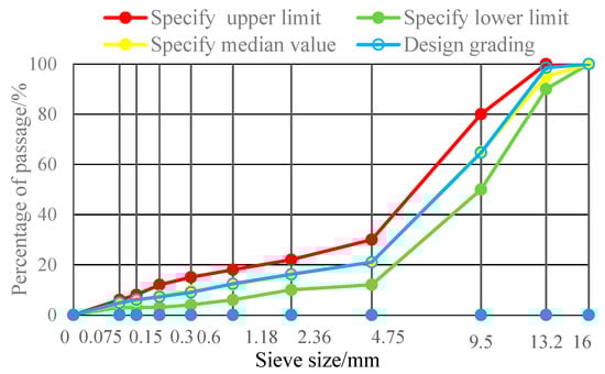 This study adhered to the Chinese specification CJJ/T 190 [61], with the aggregate gradations blended as shown in Table 7 and Figure 1. In line with typical porous asphalt mixtures, the design air void ratio was 20 ± 2% [24,62,63], with 16% of the gradation passing the 2.36 mm sieve size (Table 7) and an optimal asphalt–aggregate ratio of 5.1% by weight. The mixing time of the SSPA was 3 min at 180 °C, with a 70~80 rpm mixing rate. The molding and compaction temperature was 160 °C. For each material and test condition, three sample replicates were fabricated at 50 blows using the Marshall double-sided compaction method [64].