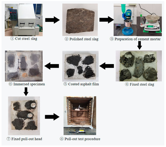The pull-out test is the process of testing the structural layer under the action of a constant vertical pull-out force until the maximum pull-out tensile force is generated, which is known to measure the bonding performance of the interlayer, such as road base-subbase layers or granular material layers [67,68]. In this paper, the pull-out test was used to study the adhesion of steel slag and asphalt after time–temperature H2O-immersion, and to evaluate the water stability of SSPA, and is photographically shown in Figure 2 [40]. The first step was to cut the large steel slag aggregates into small blocks using a SYD-0850 asphalt mixture plate cutting machine. Thereafter, cement mortar was prepared to affix the steel slag cubes to the test molds. The test mold, containing the steel slag cubes and cement mortar, was then put into a wet-air protection box for 24 h, curing at ambient temperature, followed by the removal of the molds. Thereafter, liquefied asphalt was evenly coated onto the aggregate surfaces, following the time–temperature H2O-immersion curing sequence that was described in Section 2.4.1 of this paper.
