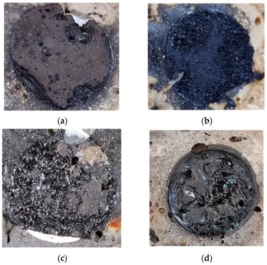 Figure 3. Pull-out test damage mechanisms. (a) Adhesion damage. (b) Cohesive damage. (c) Mixed damage. (d) Dislodgement damage. - As shown in Figure 3b, cohesive damage refers to the internal damage within the asphalt itself [69], without the adhesion damage between the asphalt and aggregate.