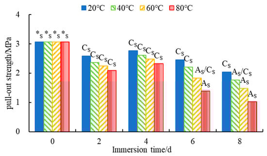 Pull-out strength results after time–temperature H2O-immersion. *s indicates the dislodgement damage strength; AS indicates the adhesion damage strength; CS indicates the cohesive damage strength; and AS/CS indicates the mixed damage strength.