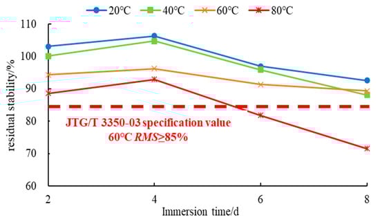 As can be seen from Figure 5, at 20 °C, 40 °C, 60 °C, and 80 °C temperature conditioning after 2 days of H2O immersion, the residual stability of the SSPA samples were 103%, 100%, 94%, and 88%, respectively. All these numbers are greater than 85% and satisfactorily meet the Chinese specification JTG/T 3350-03 [57] of a minimum residual stability requirement of 85%. Therefore, the SSPA’s high-temperature water stability after 2 days of H2O immersion was deemed to be satisfactory.