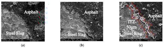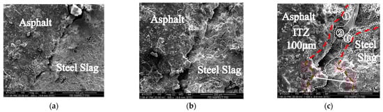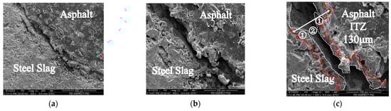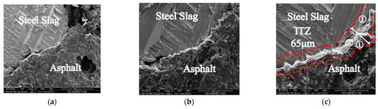 Figure 6, Figure 7, Figure 8 and Figure 9 show the SEM results of the asphalt–steel slag aggregate interface in the SSPA after medium- and high-temperature H2O immersion. In the figure, ① referred to the adhesion area of asphalt film on the surface of steel slag aggregates; ② referred to the compound phase area of asphalt and steel slag formed by physical and chemical interaction between asphalt and steel slag aggregates. As shown in Figure 6, the asphalt film thickness was uniform and tightly wrapped on the surface of the steel slag aggregates after the 2 d–60 °C H2O-immersion curing. The interface transitional zone of the asphalt–steel slag aggregates was also uniform and flat. After 4 d–60 °C H2O immersion, Figure 7 shows a substance with a white color (i.e., possibly CaCO3, C-S-H, and CaSO4·2H2O, etc.) produced via the chemical reaction between the asphalt and hydration product of steel slag. Additionally, it was also observed that the white substance was uniformly distributed in the transitional zone of the asphalt–steel slag interface, which ultimately filled up the gap of the interfacial transition zone (ITZ) and provided a good mechanical bond. This indicates the asphalt film closely adhered to the surface of the steel slag aggregate and can adsorb more free asphalt to form structural asphalt, leading the ITZ to be denser and flatter, ultimately improving the water stability of SSPA. Furthermore, in Figure 7c, compared with Figure 6c, it can be found that there were many more pores on the asphalt surface, which was due to the water molecules gradually eroding the asphalt with an increase in the H2O immersion time, and the surface of the steel slag was even denser, indicating that under these H2O immersion conditions the asphalt itself is damaged by water molecules, and the products of the chemical reaction between the steel slag and the asphalt adhered to the steel slag surface, protecting the steel slag from the water molecules.
