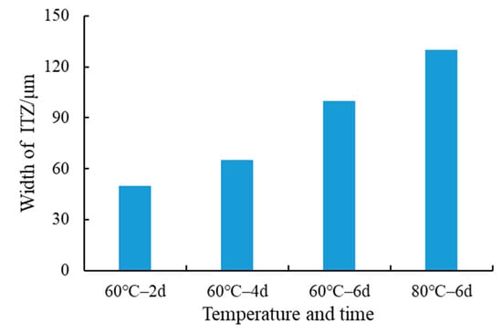 In Figure 9, the asphalt film on the surface of the steel slag aggregates peeled off after 6 d–80 °C H2O immersion, indicating that the surface area between the steel slag aggregates and asphalt film becomes smaller; the ITZ also increased, while the adhesion force decreased [83,84]. Under these conditions, the high-temperature water molecules diffused within the interface between the asphalt and steel slag aggregates at a relatively high speed with considerable destructive force. In addition, asphalt is a viscoelastic and temperature-sensitive material [85,86,87]. Therefore, the 80 °C high temperature would inherently reduce the viscosity and enhance the fluidity of the asphalt, ultimately leading to a decay in the water stability of SSPA. Figure 10 shows a plot of the ITZ as a function of H2O immersion temperature and time.