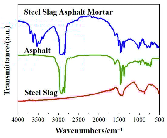 In this study, the FTIR testing [47,70] of the steel slag powder, SBS-modified asphalt, and the steel slag asphalt mortar, after a series of time–temperature H2O-immersion sequences (see Section 2.4.1), was carried out using a Nicolet IS10 Fourier transform infrared spectrometer sourced from Thermo Company, Waltham, MA, USA. The test wave number range was 400~4000 cm−1, with a resolution of 2 cm−1. The captured test data were processed and analyzed by converting the time domain function interferometric images into ordinary infrared spectrograms using a Fourier transformation [71] and the OMINIC8.0 software [72]. The FTIR test was repeated three times for each sample, with the corresponding average serving as the final test result.