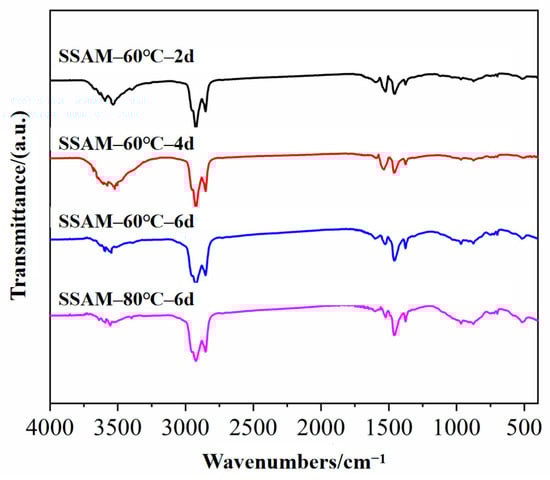 At a macroscopic level, the pull-out test results indicated that after 2~6 d–60 °C H2O immersion, the damage mechanism rapidly evolved from cohesive to mixed damage, while adhesion damage appeared after a long time (>4 days) of high-temperature H2O immersion. On the other hand, the H2O-immersion Marshall test results indicated that after 2~6 d–60 °C or 80 °C H2O immersion, the residual stability of SSPA first increased and then decreased. At 6 d–80 °C H2O immersion, the residual stability of SSPA was 81%, which does not meet the 85% Chinese JTG/T 3350-03 [57] specification requirements. In addition, after medium-temperature H2O immersion, the results of the pull-out test were mostly cohesive damage, and the residual stability of SSPA was greater than 85%, which met the Chinese JTG/T 3350-03 specification requirements. Therefore, we selected the most representative experimental data, and analyzed the reason for why the water stability of SSPA first increased and then decreased through 2~6 d–60 °C H2O immersion, and comparatively analyzed the reason for why the residual stability of SSPA was lower than 85% through 6 d–60 °C or 80 °C H2O immersion. To sum up, based on the macroscopic test data, SEM, FTIR, and XRD tests on SSPA and SSAM samples after 2~6 d–60 °C and 6 d–80 °C H2O immersion were conducted to microscopically analyze the moisture damage mechanism of SSPA after time–temperature H2O-immersion curing.
