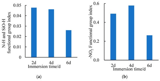 From two to four days, the residual stability first increased and thereafter decreased, with an increase in the H2O immersion time at different H2O immersion temperatures. However, the residual stability significantly decreased with an increase in temperature. As the surface of the steel slag aggregates is rough and alkaline, it tends to have a better adhesion with the weakly acidic asphalt [80]. In the early stages of H2O immersion, an acid–base chemical reaction occurred between the steel slag aggregates and asphalt; the alkanes in asphalt are easy to react with the silicon-containing compound on the surface of the steel slag to generate the silane [15,81], which inherently provided the chemical adhesive force and correspondingly improved the water stability of the SSPA. Furthermore, the asphalt film on the steel slag aggregate surfaces played a crucial role in enhancing the water resistance and reducing the possibility of hydration of the steel slag aggregates, as well as inhibiting the volume expansion of the steel slag aggregates. However, with an increase in the H2O immersion time and temperature, the adhesion between the asphalt and steel slag aggregates decreased; this led to the asphalt film on the surfaces of the steel slag aggregates to gradually fall off, with the pores on the surfaces of the steel slag aggregates quickly absorbing a lot of water [82]; that is, the volume stability of the steel slag aggregates declines and contributes to weakening the internal stability of the structure of SSPA, causing surface volume expansion of the SSPA and, ultimately, a decrease in the water stability.
