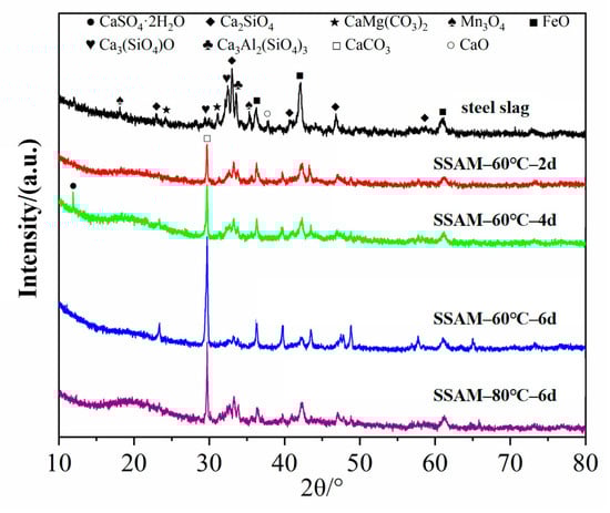 For XRD testing [73], a D8-Discover X-ray diffractometer from Bruker (Hamburg, Germany) was used to analyze the chemical phases of the steel slag powder and steel slag asphalt mortar after a series of time–temperature H2O-immersion sequences, which have been described in Section 2.4.1 of this paper. A step scan, with an angle range from 5° to 80° and a scan rate of 2°/min, was used. The XRD test data were processed and analyzed using the Jade9.0 software [74]. For each sample, the XRD test was repeated three times, with the corresponding average serving as the final test result.