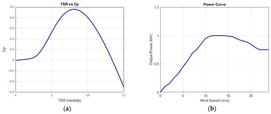 (a) TSR vs. Cp. (b) Power curve of 1 kW wind turbine.