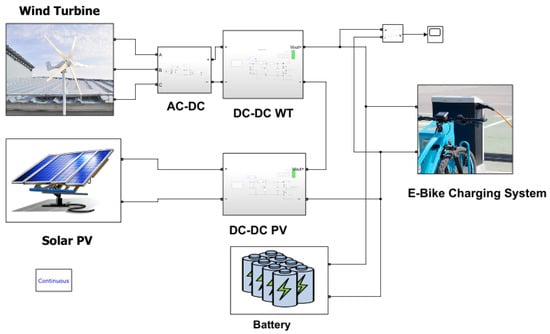 The Simulink model for a hybrid wind–solar E-bike charging station includes a wind turbine, PV system, lithium-ion battery, charge controller, inverter, and DC–DC converter. The wind turbine and PV system generate power, which is input to a DC bus and connected to the battery through a charge controller. The DC bus is also connected to an inverter, which converts the power to AC power to charge the electric bike battery. The inverter output is connected to a DC–DC converter, which regulates the voltage to match the requirements of the electric bike battery. The electric bike battery is connected to a load representing the bike’s charging [28]. The hybrid wind–PV microgrid power system for the proposed research that is simulated in MATLAB/Simulink is shown in Figure 3 below.