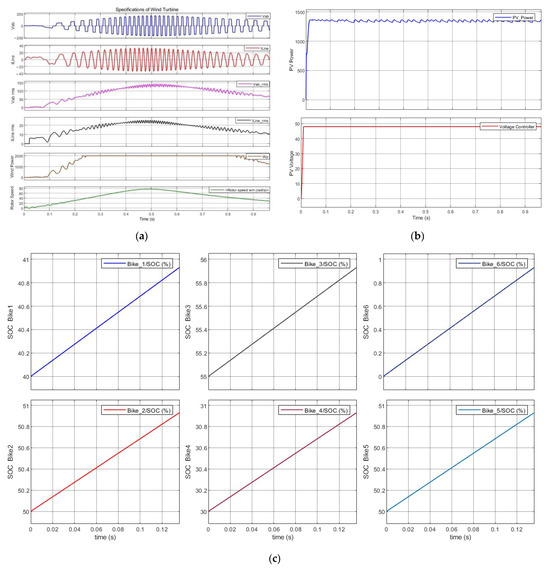 (a) Simulation results of wind turbine. (b) Simulation results of solar PV. (c) Simulation results of SOC% of E-bike charging.