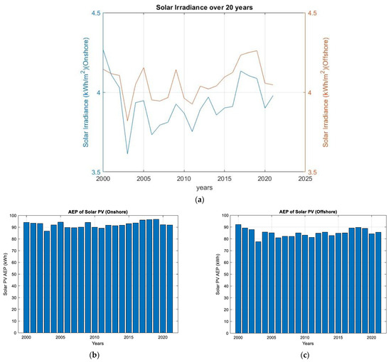 The AEP of wind and solar energy has been thoroughly examined in this research article for both onshore and offshore locations. It has been determined via careful analysis of wind resources’ performance parameters and energy outputs that offshore sites have a significantly higher AEP than their onshore counterparts, illustrated in Figure 9 for offshore and Figure 10 for onshore locations. Similarly, the AEP analysis is calculated for PV solar for both onshore and offshore sites, illustrated in Figure 11. The study considers several variables: wind patterns, solar irradiation levels, geographic location, and technology developments in onshore and offshore installations [26]. The enormous potential of offshore locations to collect renewable energy on a large scale is highlighted by the observed considerable differential in AEP, which has positive implications for sustainable energy generation and climate mitigation measures.