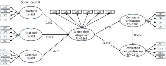 We constructed reflective multi-item measurements based on items adopted from previous studies. Measurements for social capital were adopted from Nahapiet and Ghosal [49] and Johnson, Elliott, and Drake [97]. A total 12 items to measure three dimensions of social capital (structural capital, relational capital, cognitive capital) were adopted (4 items for each dimension). Supply chain integration was operationalized using 6 items adopted from Narasimhan and Jayaram [98] and Huo et al. [59]. Lastly, corporate performance was operationalized using 4 items adopted from Younis, Sundarakani, and Vel [99] and Chen et al. [81] while destination competitiveness was operationalized using 3 items adopted from Lee, Choi, and Breiter [100] and Altinay and Kozak [86]. All items were measured on a 5-point Likert-type scale ranging from 1 (strongly disagree) to 5 (strongly agree). The measurement items were validated and finalized based on consultation with experts currently working in the MICE industry.