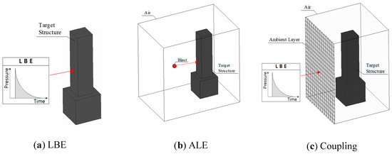 LS-DYNA, a FEM-based software program, can accurately predict the responses of members to impact loads that act in a short period, such as blast loads [11]. The blast load modeling methods provided by LS-DYNA include the load blast enhanced (LBE) method, arbitrary Lagrangian–Eulerian (ALE) method [12], and coupling method [13], which combines the LBE and ALE methods. The modeling information for these methods is summarized in Figure 1.