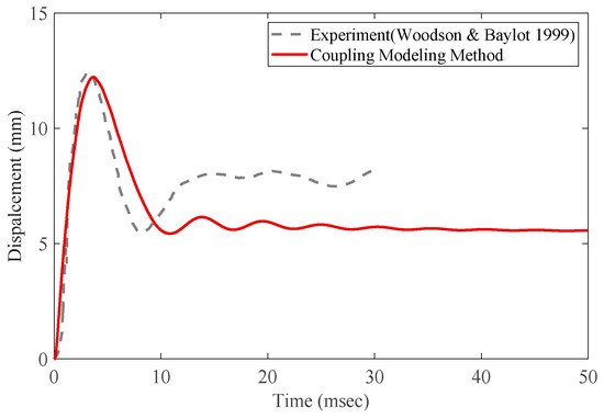 Shin and Jeon [10] modeled the RC column measured from a previous experimental study for blast loading [18] using the coupling method and compared its dynamic response under a blast load with the response in the experiment to validate the reliability of the coupling method. Figure 2 shows the dynamic response results of the actual experimental column and the FE model column under the same blast loading conditions. For an accurate comparison, the results of previous numerical studies that modeled the same column were compared and evaluated. The column model that used the coupling (coupled LBE–ALE model) method developed in the study showed an error of approximately 3.4% with respect to the result of the actual experiment based on the maximum displacement, thereby exhibiting higher reliability compared to other numerical analysis studies. Therefore, this study utilized the coupling modeling method simulating blast loads.