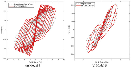 Figure 5 shows the displacement–force relationships of the column models subjected to the same static cyclic loading conditions as in previous experiments [22,23]. The initial stiffness, maximum strength, and strength reduction ratio of the simulated responses were compared to the experimental results as given in Table 4. For Model-F, the strength is slightly decreased after reaching the maximum strength, similar to the test result for the flexure-governed column. However, Model-S shows significant strength reduction after the shear failure. This column behavior represents the shear-governed column. As given in Table 4, the simulation variation in the initial stiffness, maximum strength, and strength reduction ratio between experimental and simulated responses was less than 12% for Model-F and approximately 20% for Model-S. However, because both models exhibited the simulation variation of approximately 10% for the initial stiffness and maximum strength, the simulated responses have good agreements with the experimental results. This variation is attributed to the modeling assumptions. To reduce the computational time of the FE models, the foundation elements (footing) were simply modeled using elastic materials with the effective stiffness. This is because the critical damage on the foundation elements was not found in the previous experimental studies. Additionally, the bond-slip effects between reinforcing bars and surrounding concrete were controlled using the frictional forces.
