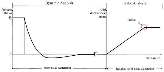 Figure 7 shows the loading protocol applied to evaluate the residual resisting capacity of the RC columns developed in this study. The load reflected in this study can be divided into dynamic analysis and static analysis sections. The pressure over time that represents the blast loads acting on the dynamic analysis section showed a sharp increase in the blast load and the occurrence of the instantaneous maximum pressure as the load reached the structure. Thereafter, a negative pressure section occurred as the reflected wave generated by the contact between the explosion wave and the structure or ground met the existing explosion wave. After the negative pressure section, the pressure reached zero and there was no change in pressure. Thus, the blast loads acting on the column ceased existing. To examine the residual performance of the column under blast loads, an axial load was applied to the column after the blast load with the displacement-controlled method in the static analysis section. When the axial displacement is consistently increased over a certain period, the failure of the column is determined if the displacement stops increasing or if it decreases.
