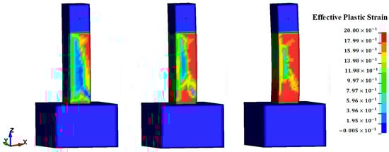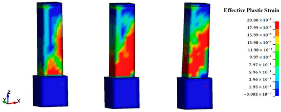 Figure 8 and Figure 9 show the effective plastic strain (EPS) of Model-F and Model-S by blast loads, respectively. The maximum stress that occurs after the arrival of blast loads at the column can be observed at the bottom and rear parts of the column. Therefore, the maximum moment occurred at the bottom of the column, and the maximum tension was detected at the rear part of the column. In the stress–strain relationship of concrete, the section in which the strain is smaller than the strain corresponding to the maximum strength is referred to as the hardening section (0 < EPS < 1.0), while the section in which the strain corresponding to the maximum strength is exceeded is referred to as the softening section (1.0 < EPS < 2.0). If the stress change color of the RC column is closer to red, then the concrete member reaches the softening section and cracks or fractures occur in it. In the case of Model-F, fewer concrete meshes reached the softening section compared to Model-S. Therefore, fewer cracks or fractures occurred in Model-F under the same loading conditions because its ductility is higher than that of Model-S. In particular, it can be observed that fractures occurred in most of Model-S and that cracks occurred in the diagonal direction. This is the typical crack pattern of shear failure.