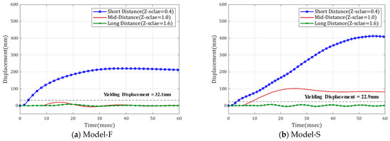 Figure 10 shows the time–displacement response results of the columns according to the explosion scale for blast performance evaluation through the ductility-based performance limits. It can be observed that the maximum response () decreased as the blast load occurrence distance increased. In particular, because the responses of the columns did not exceed the yielding displacement under the scenarios of Z-scale = 1.0 and 1.6 m/kg1/3 (Model-S for Z-scale = 1.0 m/kg1/3, no residual deformation existed after reaching the maximum displacement when blast loads were applied. In addition, the yielding displacement () was expressed in the time–displacement responses to better understand the blast behavior of the columns. When the maximum response that occurred under each scenario was lower than , the behavior of the column was observed within the elastic range. As can be observed from the figure, the maximum response of Model-F was reached in 55 milliseconds compared to Model-S (33 milliseconds). In particular, under the Z-scale = 1.0 m/kg1/3 scenario, Model-F exhibited elastic behavior, contrary to Model-S. Consequently, the flexure-governed column has a higher blast resistance to blast loads than the shear-governed column.