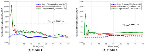Figure 11 shows the time–axial force responses of the columns according to the explosion scale for blast performance evaluation through residual axial capacity. For the residual axial capacity, the axial resistance capacity of the columns was calculated by applying axial deformation to the columns after the occurrence of blast loads. In the figure, additional axial deformation was applied to the columns from the occurrence of the explosion, at 60 milliseconds, and the axial force generated at this time was measured and expressed. Therefore, the maximum residual strength () increased as the axial load increased, and the response decreased after the axial column failure. The maximum response lower than after each blast loading scenario indicates that the residual capacity of the column is low. Therefore, the damage to the member caused by the blast loads is significant. It can be observed that the residual resisting capacity of the columns is correlated with the time–displacement response mentioned above. When the displacement response was low (i.e., displacement response lower than yielding displacement) depending on the load scenario, the axial capacity of the column was higher than . However, when the displacement exceeded the yielding displacement, the residual axial capacity of the column was lower than . In particular, the shear-governed column does not have any residual strength after the short-distance blast load (i.e., residual strength is almost zero). For the short-distance loading scenario, Model-F also suffered significant damage. However, the column model still has residual resistance shown in Figure 11a. This is attributed to column details associated with the longitudinal and transverse reinforcing details. In addition, for all scenarios, the maximum response value of Model-F was higher than that of Model-S. Thus, the flexure-governed column has higher residual resisting capacity than the shear-governed column, and it has less damage from the blast loads.