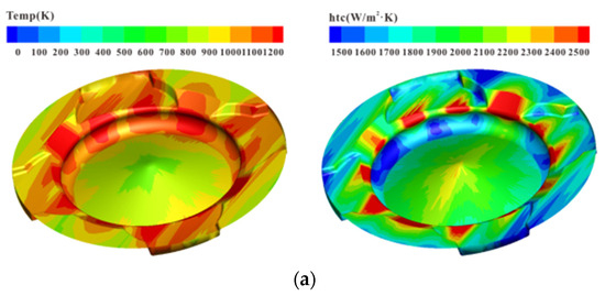The fluid average temperature near the wall surface and the heat transfer coefficient of the piston top for both cases of the baseline and LGFC combustion chamber are shown in Figure 13. It can be seen that the high-temperature region in the LGFC case was mainly concentrated in the piston bowl, and the total areas of the high-temperature region in the LGFC case were smaller than those of the baseline case. In the LGFC case, the average heat transfer coefficient decreased and became more balanced, with the areas of high heat transfer coefficient concentrating near the lips, exactly where the sprays hit the wall. This indicates that the losses of heat transfer were suppressed.