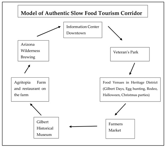 Meng and Choi [16] call for strategic marketing messages to enhance tourists’ cognition and perceptions of authenticity. The authors report that authenticity perceptions significantly predict desire and behavioral intention. Knowledge and appropriate information are important because “a tourist’s awareness and understanding of authenticity can prompt him or her to participate in various forms of slow activities” [16] (p. 406). Escalated attentiveness, with the help of educational materials informing of authentic engagement activities, can shape authenticity perceptions [19]. Enjoyable slow tourism characteristics include a feeling of relaxation, immersion in local culture and natural surroundings, and savoring the good quality of traditional/local food. These attributes epitomize demand for existentialist and objective authenticity. Previous studies have reported a significant positive relationship between perceived authenticity and the desire to visit. Perceived authenticity can assist in optimizing satisfactory experiences [1,16,29,31,35]. According to Meng and Choi, augmenting visitors’ “authentic awareness and perceptions” is one key method to stimulate desire to engage in slow food experiences [16] (p. 406). This paper uses an exploratory case study approach to examine the manner in which authenticity is promoted by food venues in a suburban town (Gilbert) in the United States. Food venues refer to a wide range of popular local settings for food consumption, ranging from iconic restaurants to a farm and the farmers market.