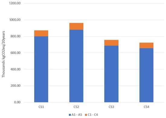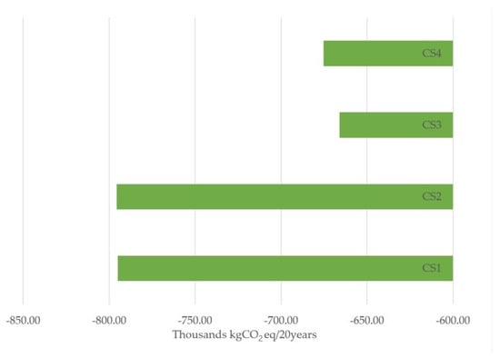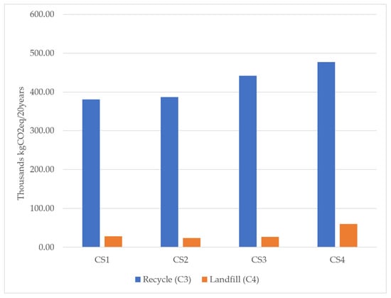 Figure 4 presents the material recovery and carbon emission reduction potential associated with each of the building systems that was considered. The negative values indicate the amount of carbon emissions that can be avoided in future projects owing to the substitution of steel, aluminium, concrete, bricks, glass, and timber during construction. As exhibited in Figure 4, CS2 generates the greatest substitution impacts or the potential for reducing carbon emissions in future construction projects. In contrast with CS1, CS2 generates slightly more (about 0.2%), CS3 creates approximately 18% less, while CS4 produces roughly 16% less than CS1.