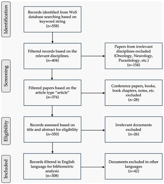 In the initial stage of document selection through the PRISMA protocol, a query was created using specific keywords and applied to the Web of Science database on the 4th of May 2023 as shown in Table 1. This resulted in a total of 558 documents being retrieved. In the second stage, the selection was narrowed down to include only relevant fields (see Figure 5), which resulted in 404 documents remaining. Medical fields appeared in the WoS database such as oncology, cardiology, entomology, obstetrics, etc. and were excluded from the study as the contents were irrelevant. In the third stage, the focus was further refined by limiting the selection to specific article types, resulting in 376 documents that met the criteria. Subsequently, the documents were imported into the Zotero application, where an additional step was taken to exclude irrelevant articles. After this step, the number of remaining documents was reduced to 350. Finally, in the fourth stage, the selection was narrowed down to include only documents written in English, resulting in a final set of 308 documents as shown in Table 2. These selection criteria, along with the use of the Zotero application for excluding irrelevant articles, were applied to ensure the relevance and quality of the chosen documents for the bibliometric research (see Figure 1).