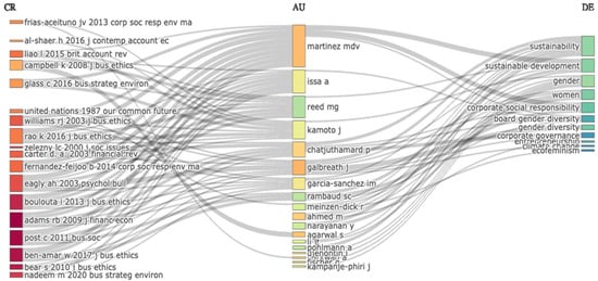 Articles with the highest citation scores were in the field of sustainability, sustainable development, gender, and corporate social responsibility. Figure 3 shows the main keywords in the topic of the articles, citation paths, and interlinkage through authors and citations.
