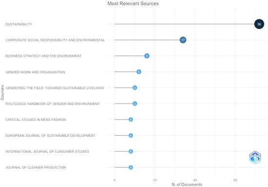 The most relevant sources for gender equality, sustainability, and urbanism studies are shown in Figure 4. MDPI’s Sustainability Journal is the main source by a long way among other sources. Wiley’s Corporate Social Responsibility and Environmental Management Journal is the second most reliable source in the research field.