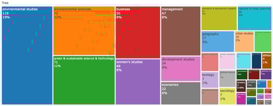 The expected research areas were urban studies and urban planning. However, as shown in Figure 6, the top three research areas were environmental studies, green and sustainable science and technology, and environmental sciences. Surprisingly, the regional and urban planning, urban studies, and social sciences areas were less contributive to the research domain. The social sciences including business, management, women’s studies, and interdisciplinary social sciences were the second most contributive areas in the research domain.