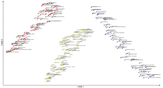 This study used t-distributed stochastic neighbor embedding (t-SNE) for visualizing high-dimensional data [43] to reveal the foci of the publications in the research corpus, to reduce dimensions, and to clarify clusters as shown in Figure 7. The analysis of the dataset derived from the research corpus for t-SNE plotted three clusters. The yellow cluster illustrates how gender influences sustainable practices and urban development. The keyword patterns in the yellow cluster are in accordance with the United Nations’ Conference on Housing and Sustainable Urban Development (Habitat III) final report in 2017. The report asserts that the objective of integrating gender considerations into environmental protection is to ensure equal opportunities for men and women to participate and benefit from environmental protection and land use by recognizing and utilizing their diverse perspectives and expertise related to environmental and urban development [21]. The purple cluster suggests the consequences and impacts of gender diversity on corporate sustainability initiatives. For example, in their study, Muhammad and Migliori [44] claimed that firms with a greater gender diversity on their corporate boards exhibited more environmentally conscious behavior, as indicated by higher environmental performance. Additionally, female leaders played a pivotal role in promoting environmental sustainability. Similarly, in their study, Martinez et al. [29] found that companies with more women on their boards were more likely to voluntarily disclose Corporate Social Responsibility (CSR) information and were more likely to be included in the Dow Jones Sustainability Index. There appears to be a positive correlation between gender diversity and corporate sustainability [30,45,46]. However, Naeem et al. [47] suggested that the impact of gender diversity on corporate sustainability indicates that the outcomes may differ based on diverse factors like corporate risks, traits, and industries. In their study, they found that the proportion of female executives had a significant negative impact on corporate green innovation.