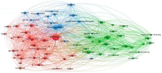 In this sense, Khalikova et al. [28] proposed that more attention should be given to gender in other areas of sustainability research, such as climate change, corporate social responsibility, food production, resource management, energy policy, and environmental behavior and education. However, even in these areas, the concept of “gender” is often limited to traditional gender roles, ignoring the impact of intersectionality on gender identity in relation to factors such as income, age, and other demographic characteristics. The red cluster as the last cluster highlights how gender perspectives contribute to sustainable development, and the environment. Odrowaz-Coates [48] argued that gender perspectives play a crucial role in sustainable development and environmental conservation. Women are more likely to take steps to reduce waste, embrace a circular economy, recycle, and promote sustainable water management. However, implementing gender-blind policies in sustainable development may lead to working primarily with men. On the other hand, targeting only women and neglecting men can occur if sustainable development issues are viewed through a gendered lens. Therefore, it is imperative to involve both men and women while considering gender [31].