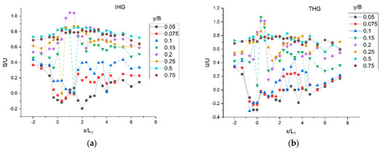 Figure 5a–f shows the variation in the normalized time averaged (i) streamwise () [Figure 5a,b], (ii) transverse () [Figure 5c,d] and (iii) vertical () velocity components [Figure 5e,f] at a vertical location over the scoured bed at equilibrium conditions, where , and denotes the time averaged velocity component in , and -directions, respectively, for both IHG [Figure 5a,c,e] and THG [Figure 5b,d,f]. In Figure 5a–f, streamwise () and transverse () lengths are normalized with respect to the length of the groyne in transverse direction to the flow (L1) and width of the flume (B), respectively. It is to be noted that the sections located at the center of the flume, tip of groyne, and very close to the side wall having groyne are represented by lateral sections , and , respectively.