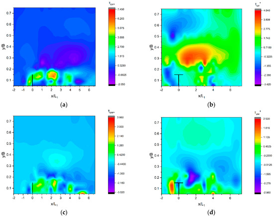 The distribution of bed shear stress in a highly turbulent flow in the vicinity of a groyne can be complex to estimate, and this complexity increases as the shape of the groyne is altered [27,63]. The normalized bed shear stress , in the current experimental study is computed using the Reynolds shear stress [64]. While Kuhnle et al. [64] calculated the bed shear stress using only the vertical Reynolds stresses, in this investigation, all three components of 3D Reynolds stresses have been used to calculate the same [39]. Here, is given by