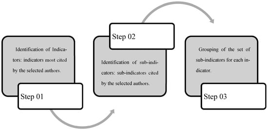 To develop the indicators, as shown in Figure 1, the indicators cited in the literature (articles presented in the previous topic) were identified, and all indicators were tabulated, verifying which ones were the most cited. These gave the indicators a name. Then, the sub-indicators were checked and tabulated according to the authors. In the next step, the sub-indicators related to each selected indicator were grouped, forming a set of sub-indicators for each indicator.